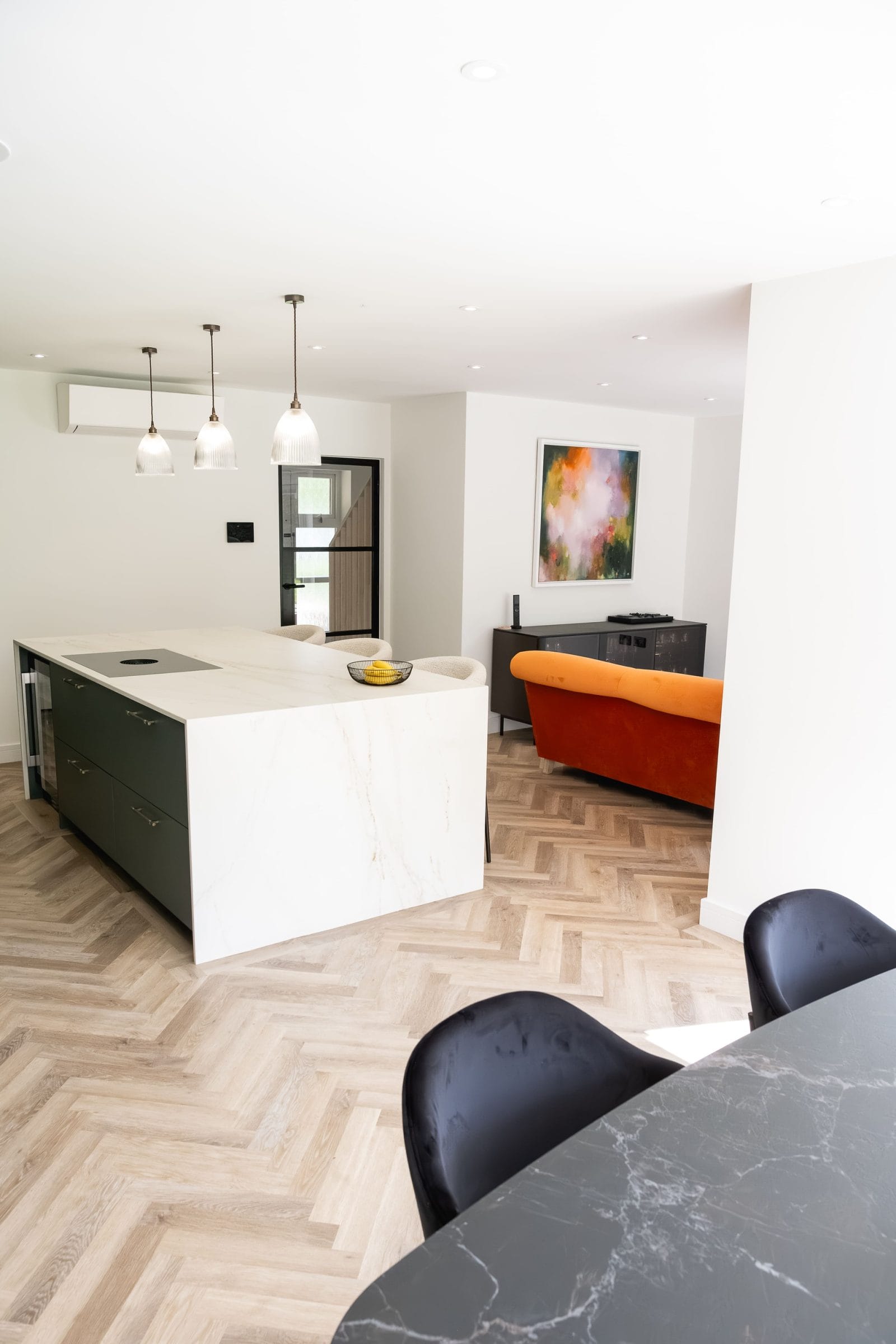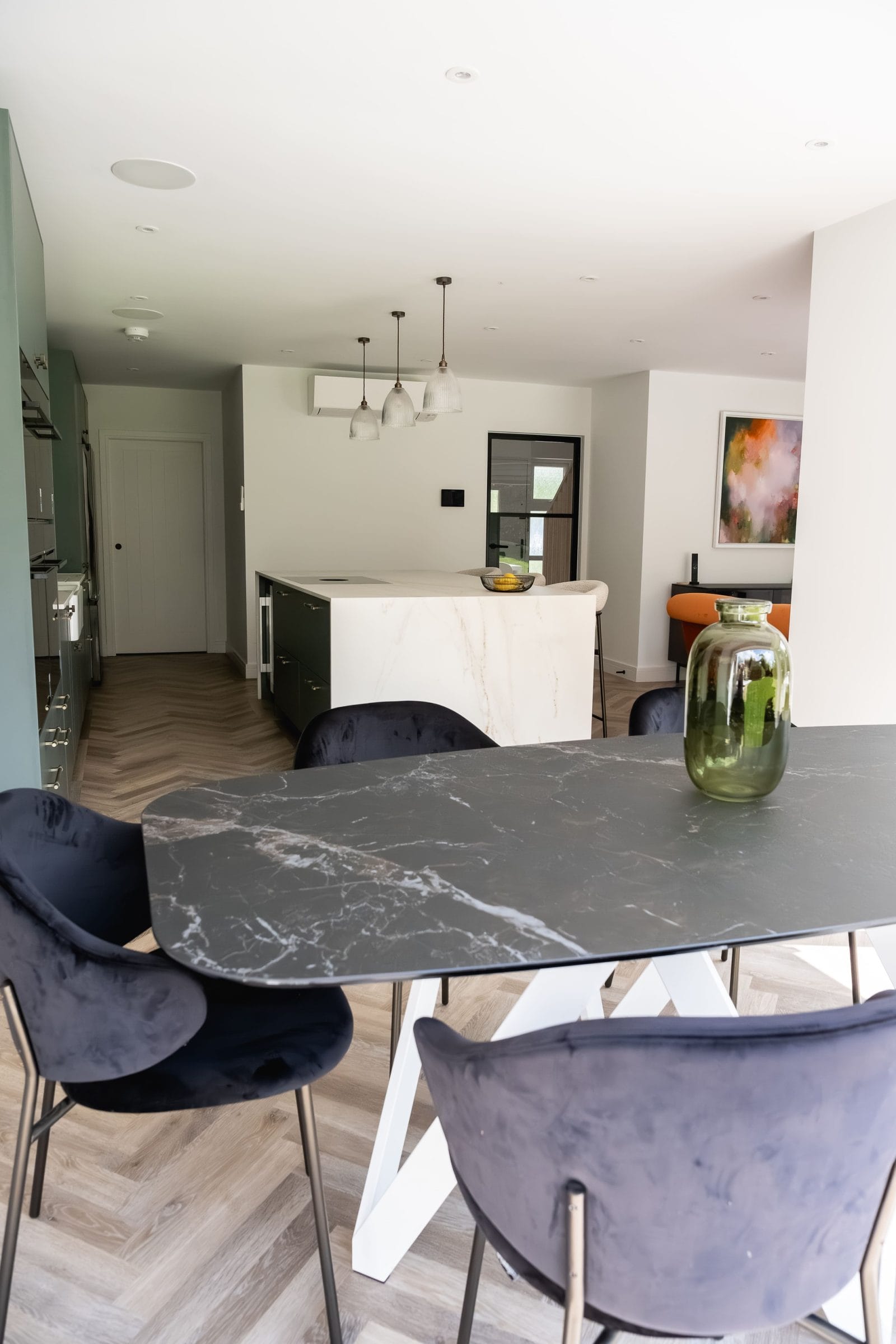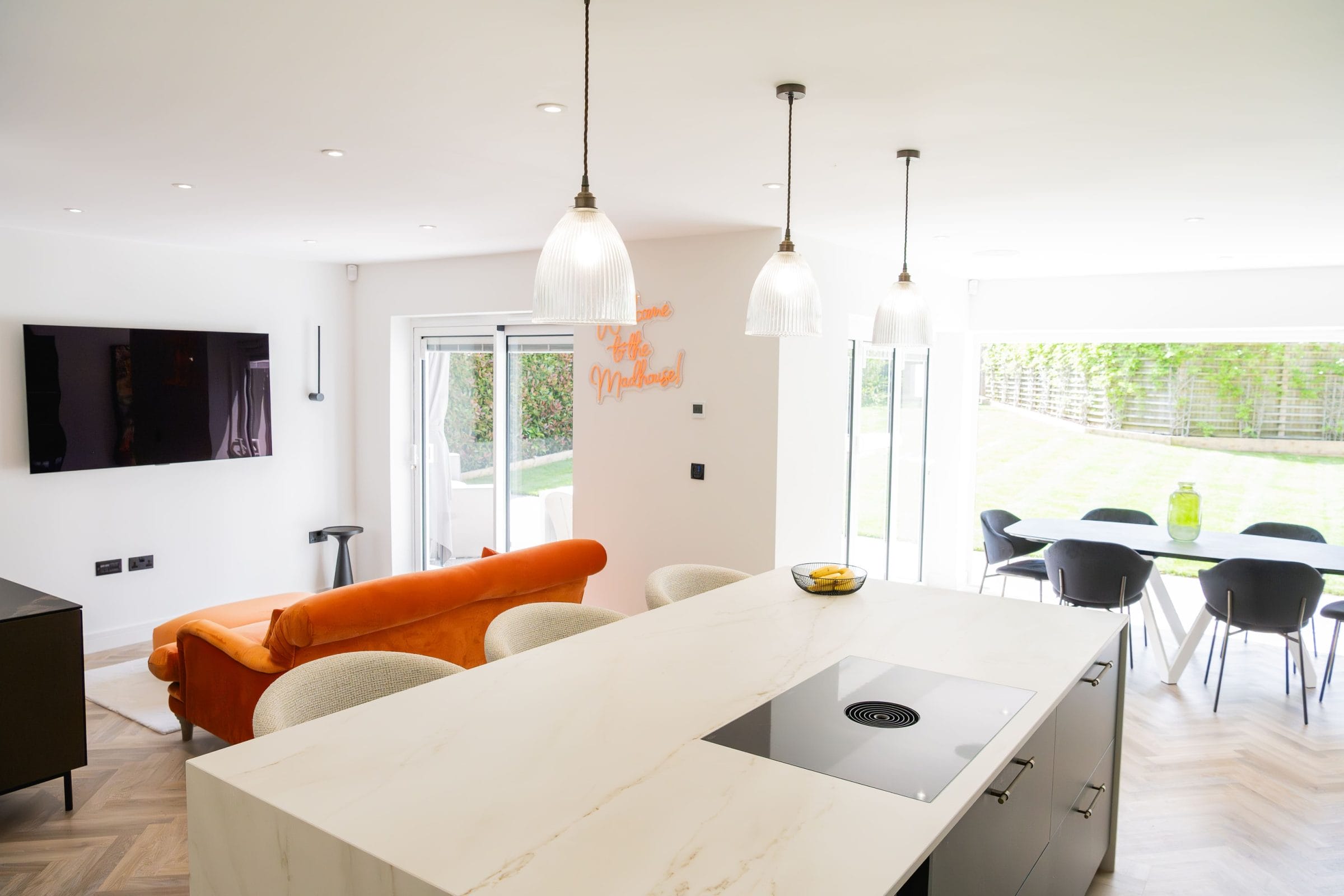 In this bright and inviting space, we combined contemporary style with practical functionality to create an open-plan kitchen diner for the family to enjoy.