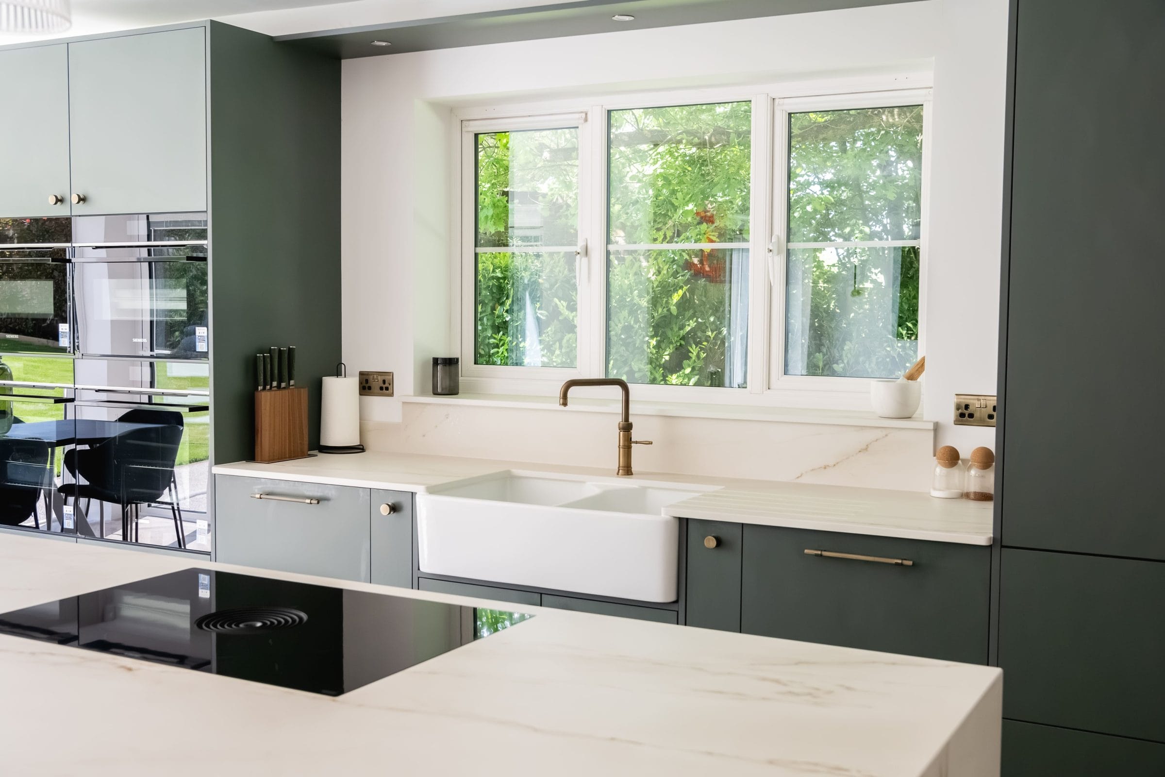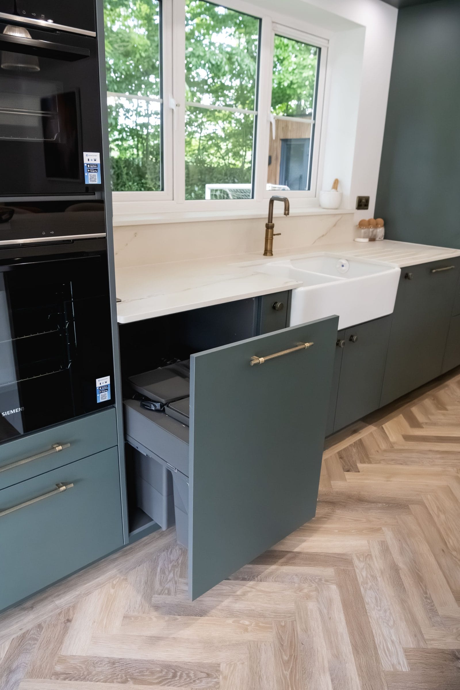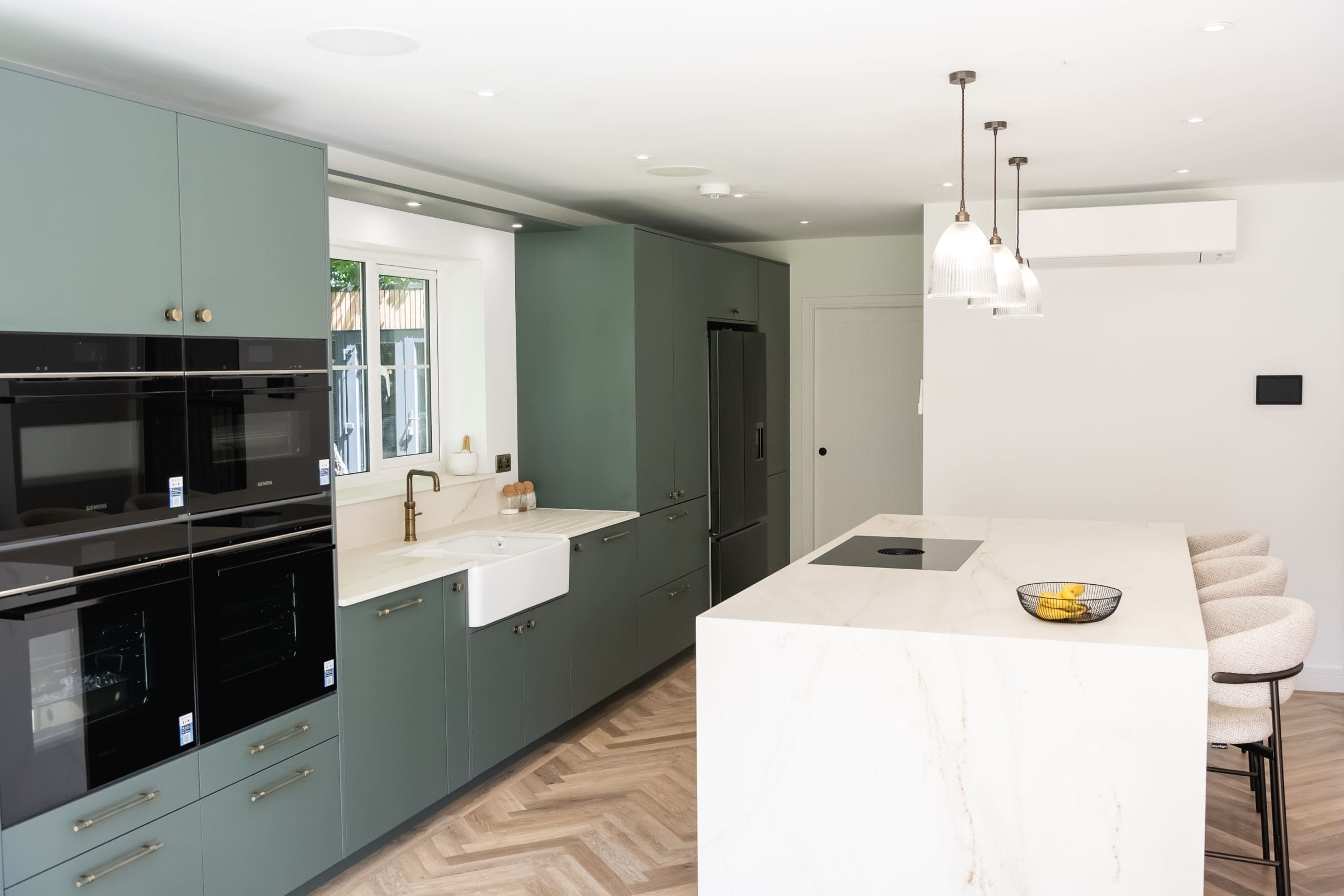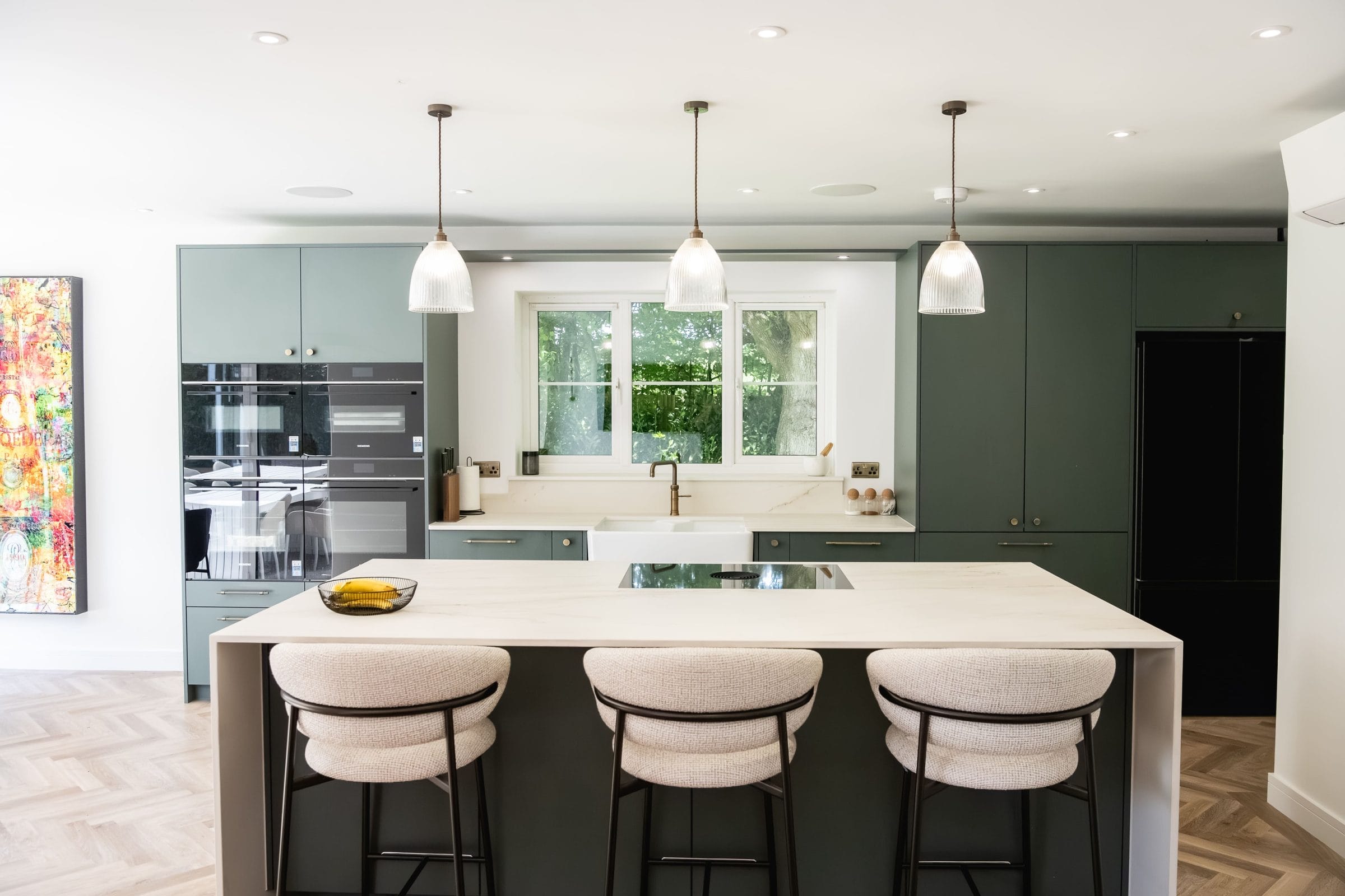 The striking dark green Brigitte cabinetry paired with brushed brass handles and sleek appliances from Bora and Siemens, creates a stylish finish that exudes sophistication and class.