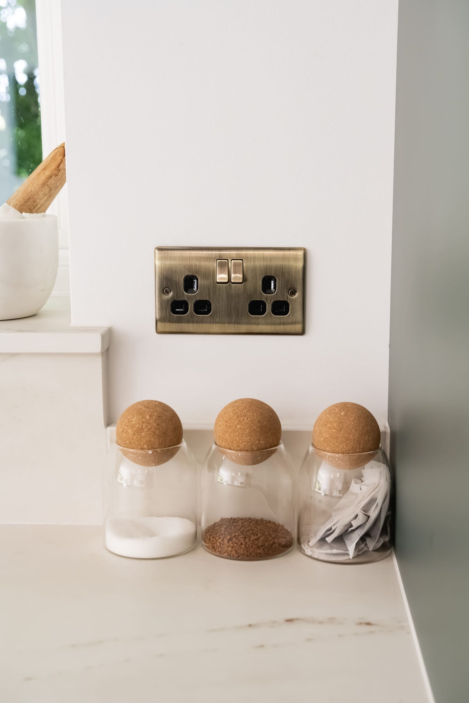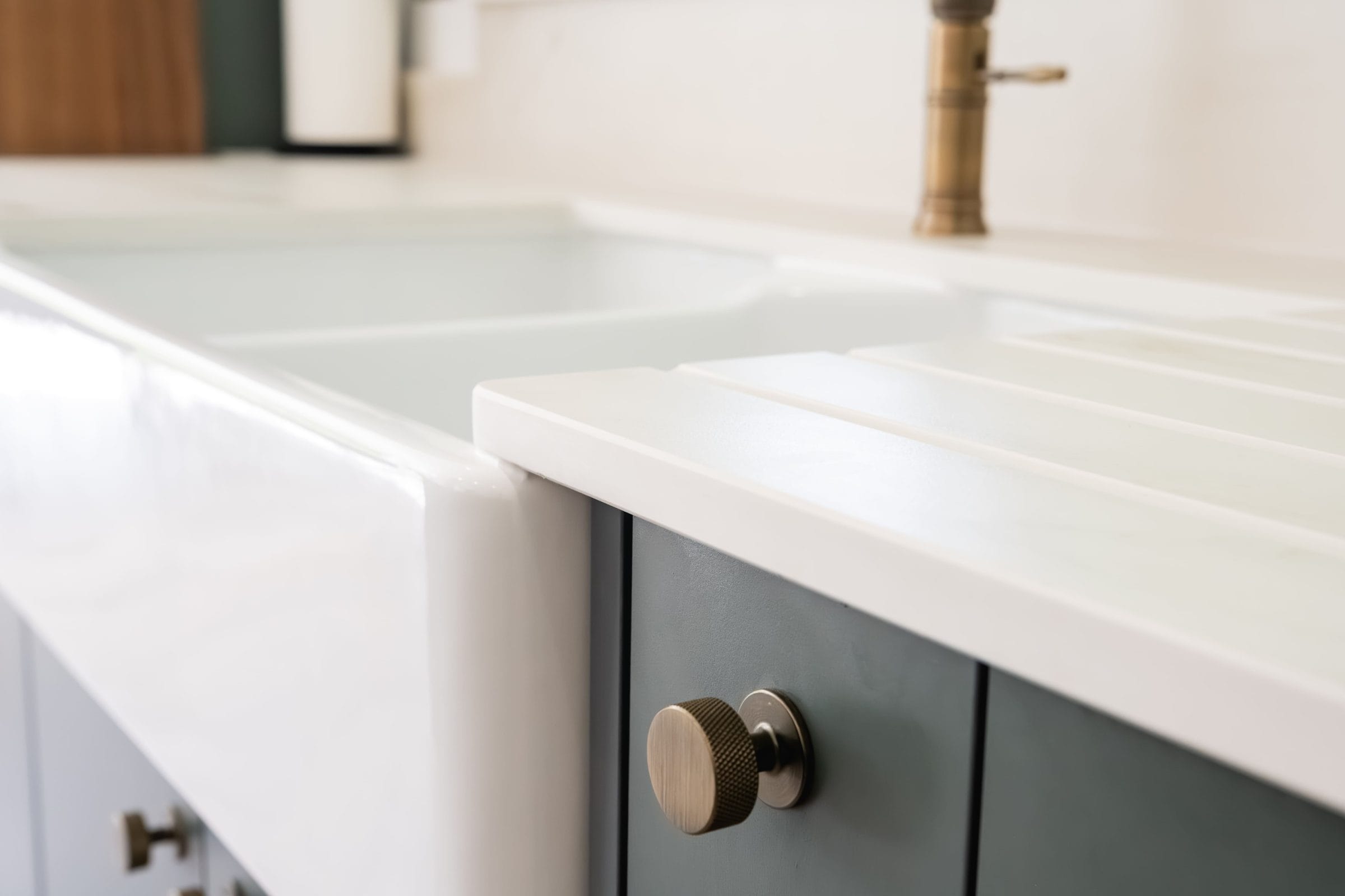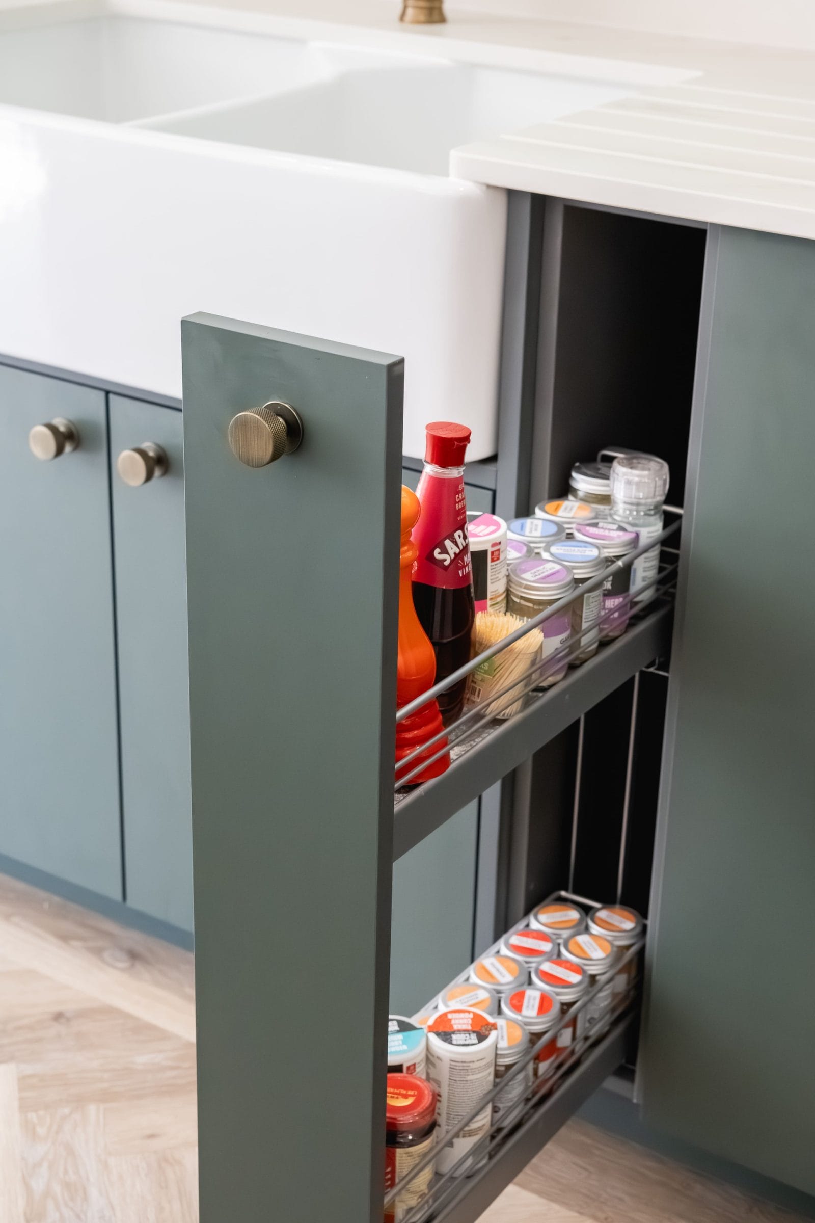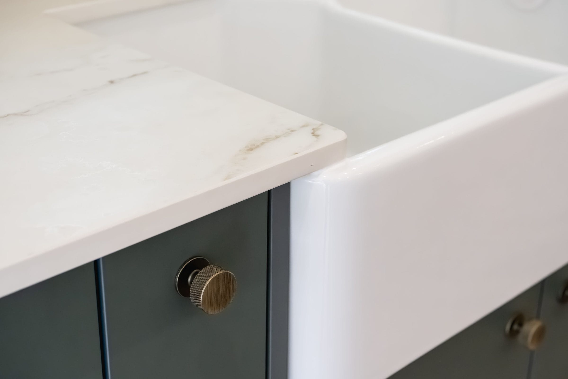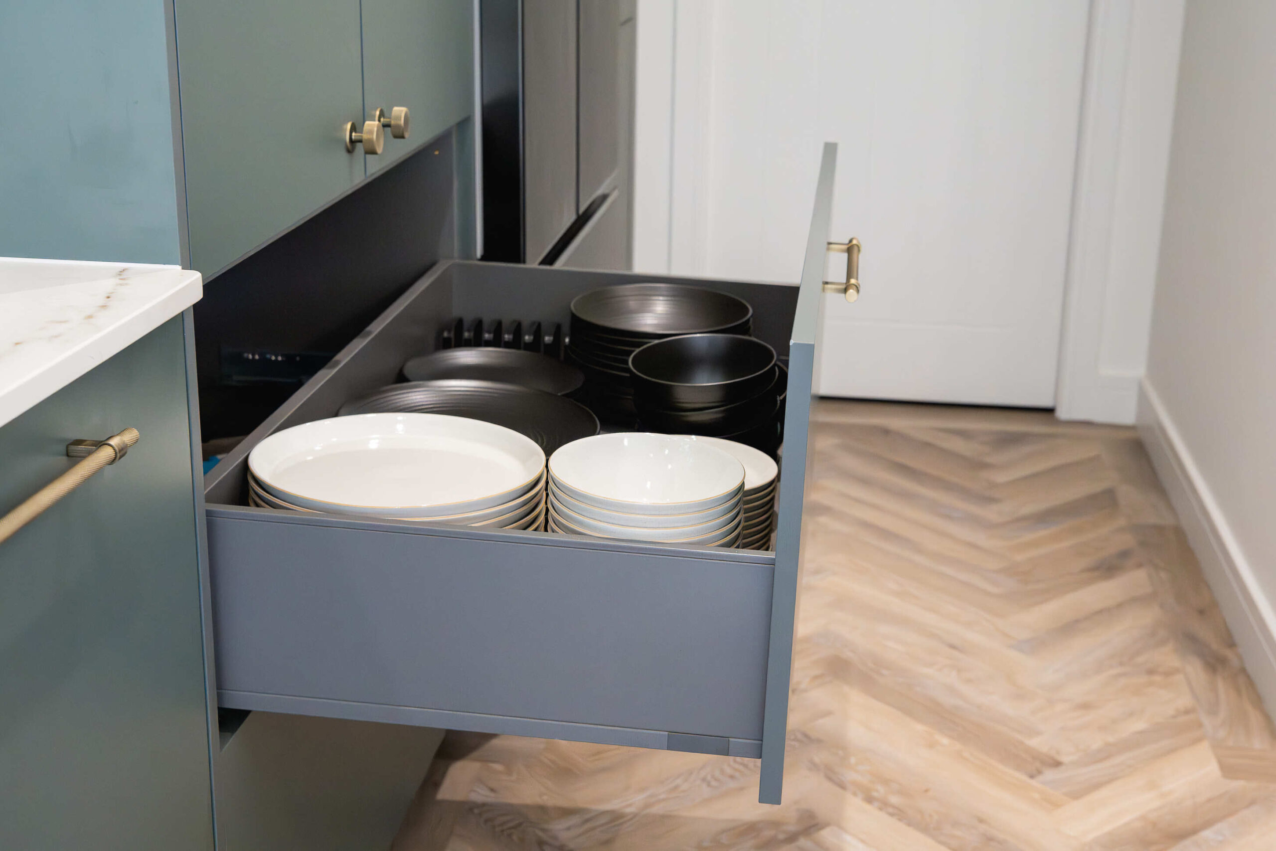 The striking dark green Brigitte cabinetry paired with brushed brass handles and sleek appliances from Bora and Siemens, creates a stylish finish that exudes sophistication and class.
