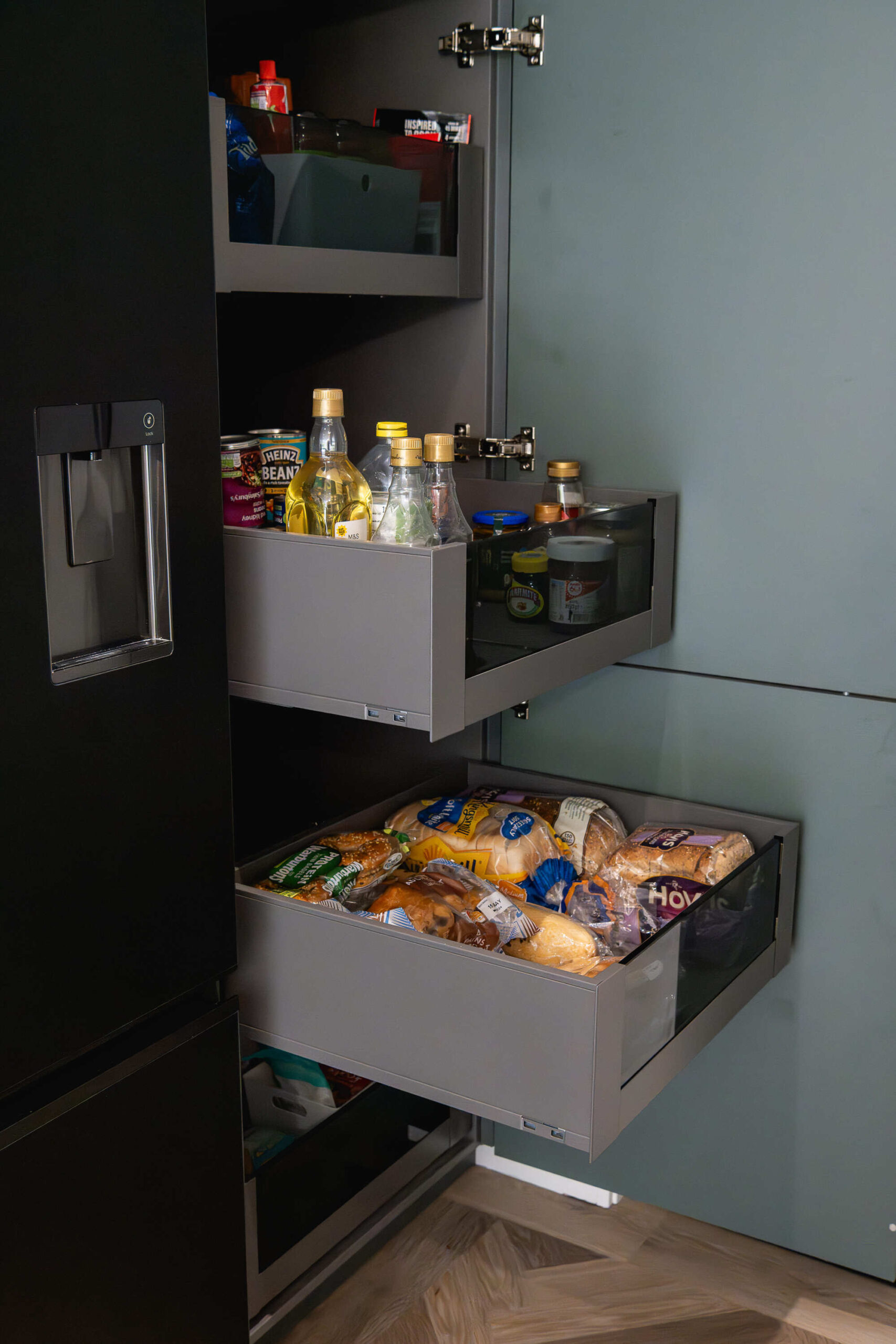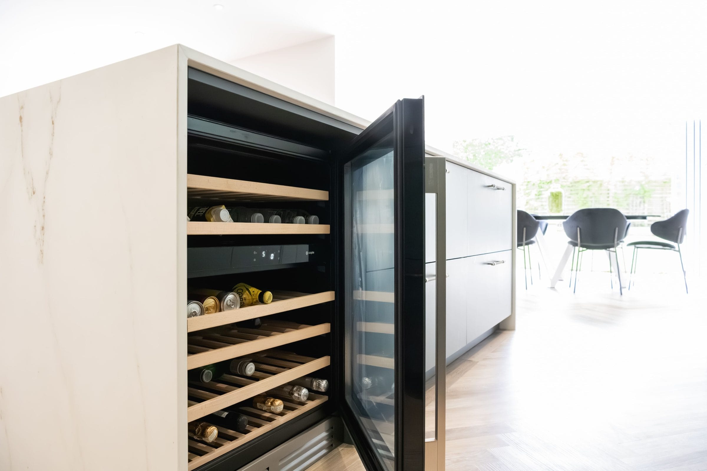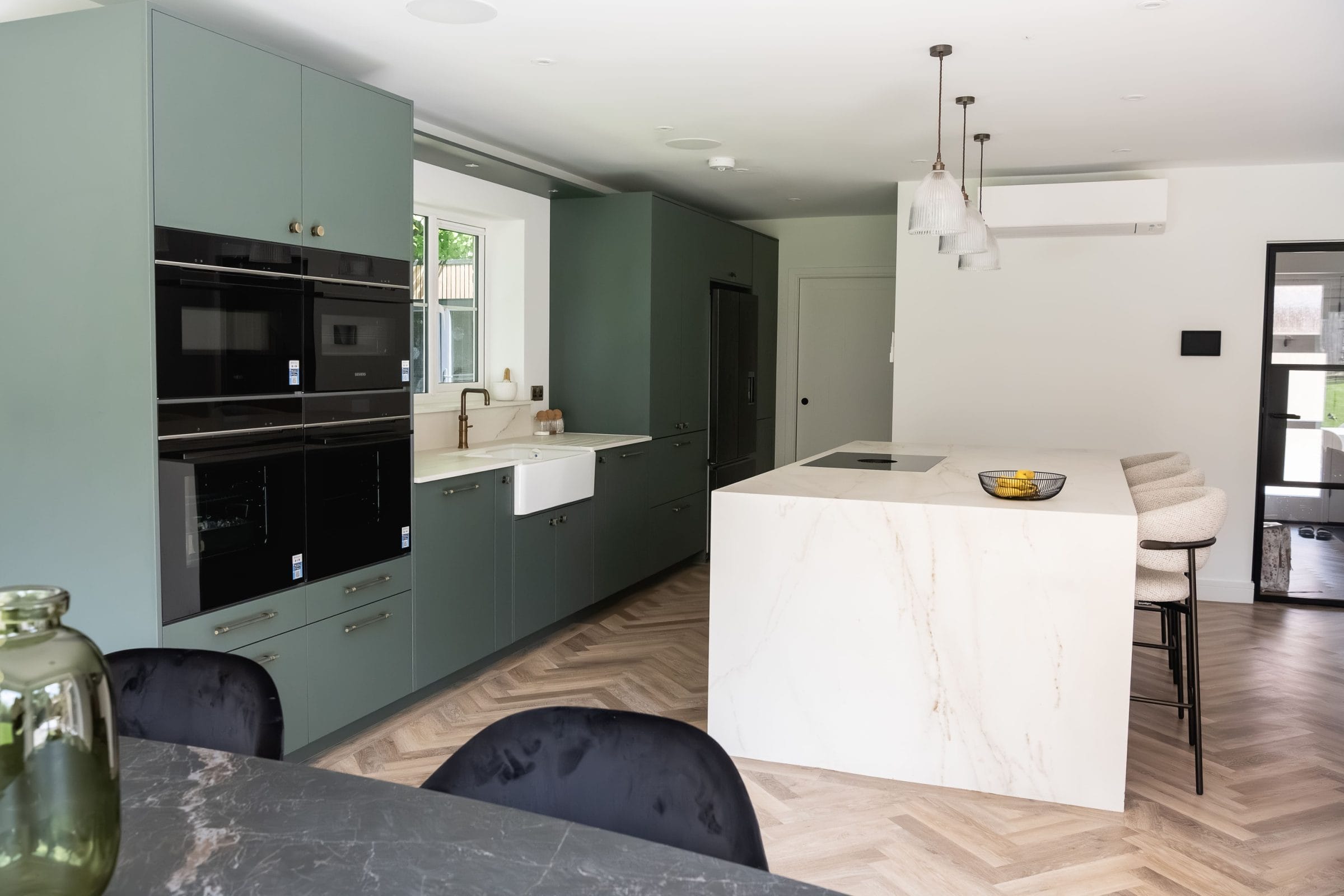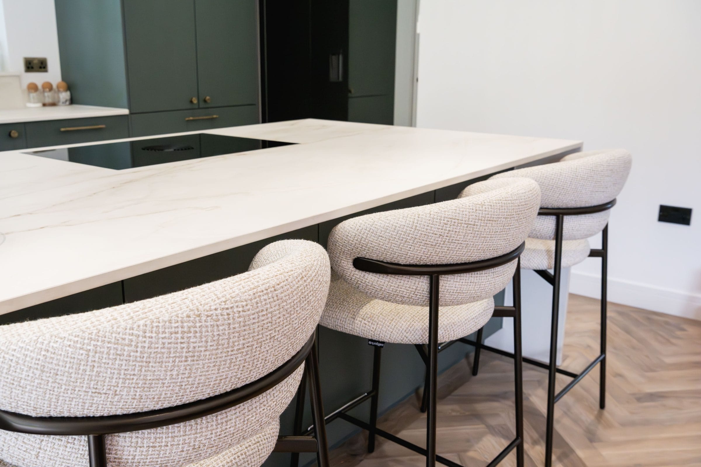 The elegant splashback and worktops from Dekton add a touch of luxury, and the island, with waterfall-mitred ends, doubles as a casual dining area. This kitchen transformed our customer’s daily routines and brought the ‘wow factor’ into their home.