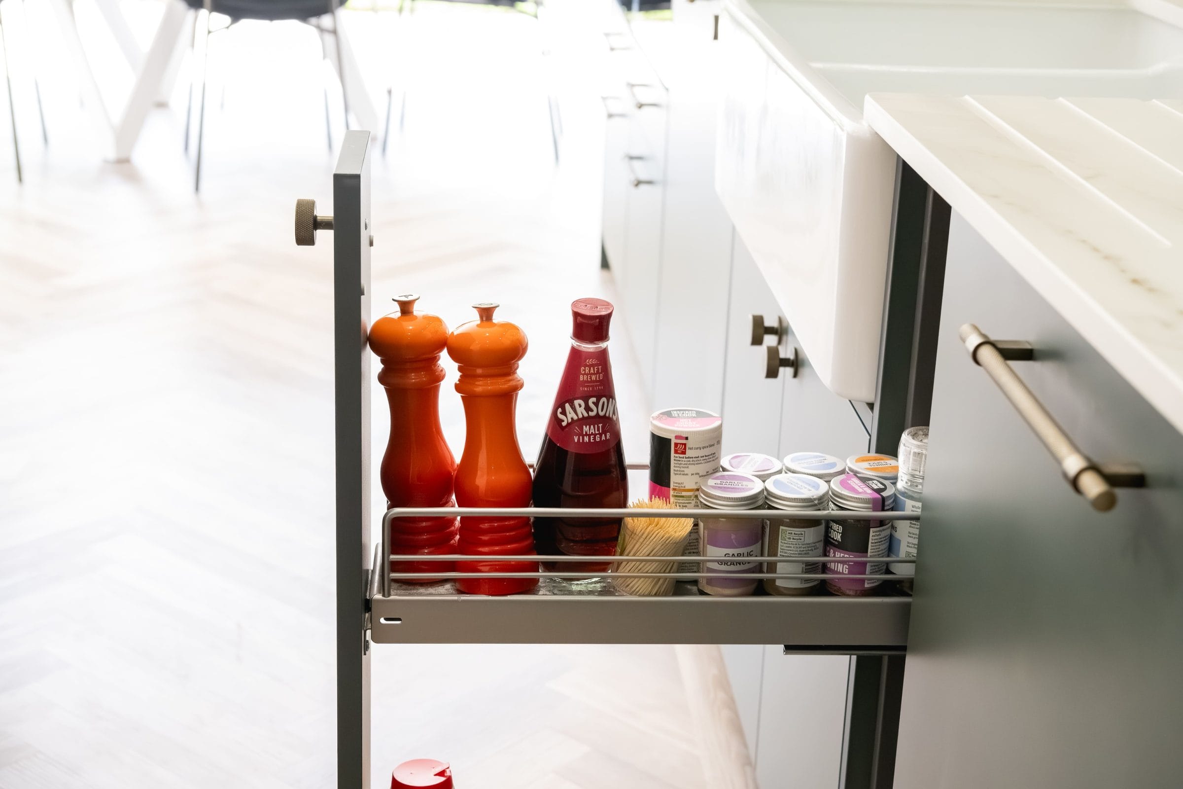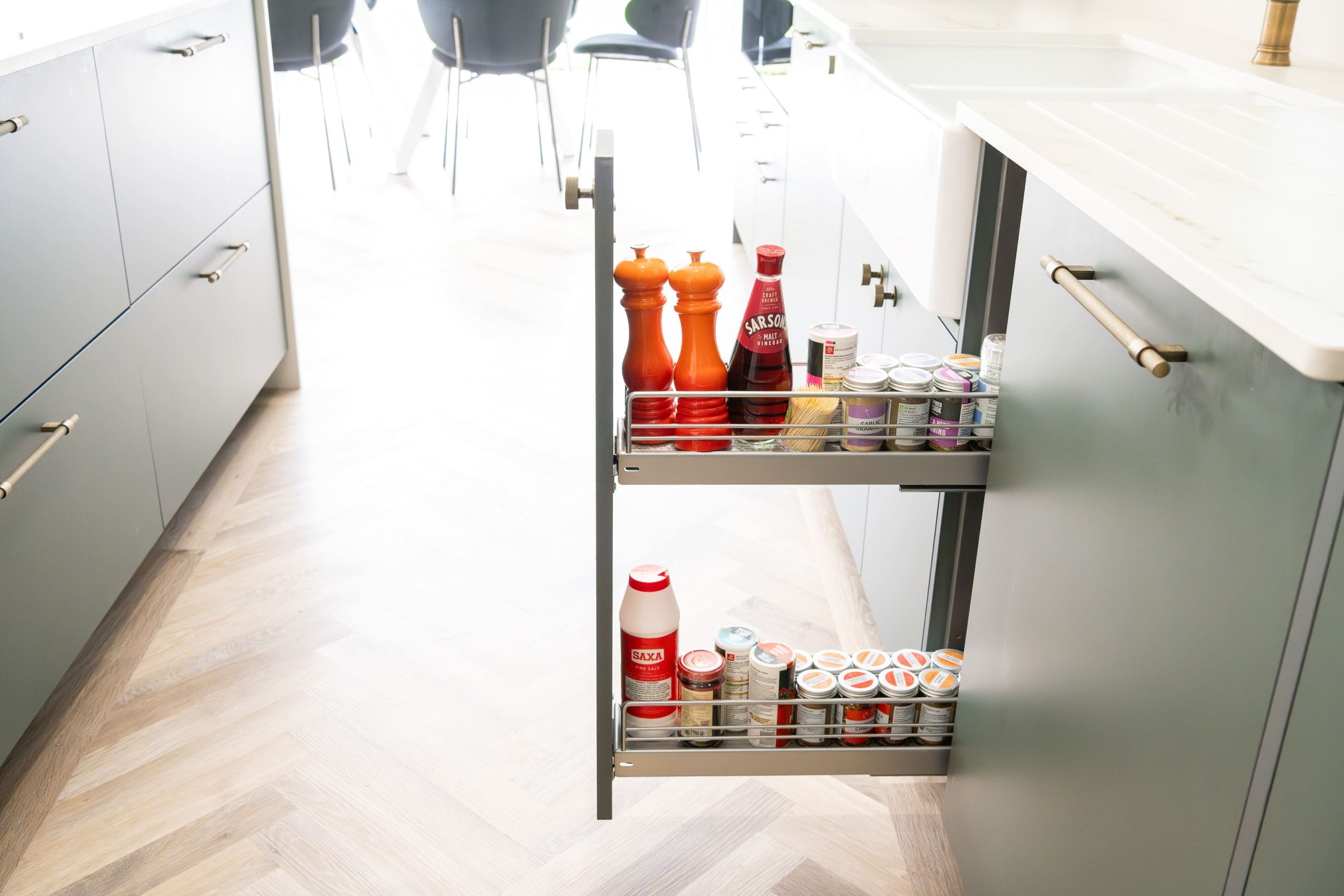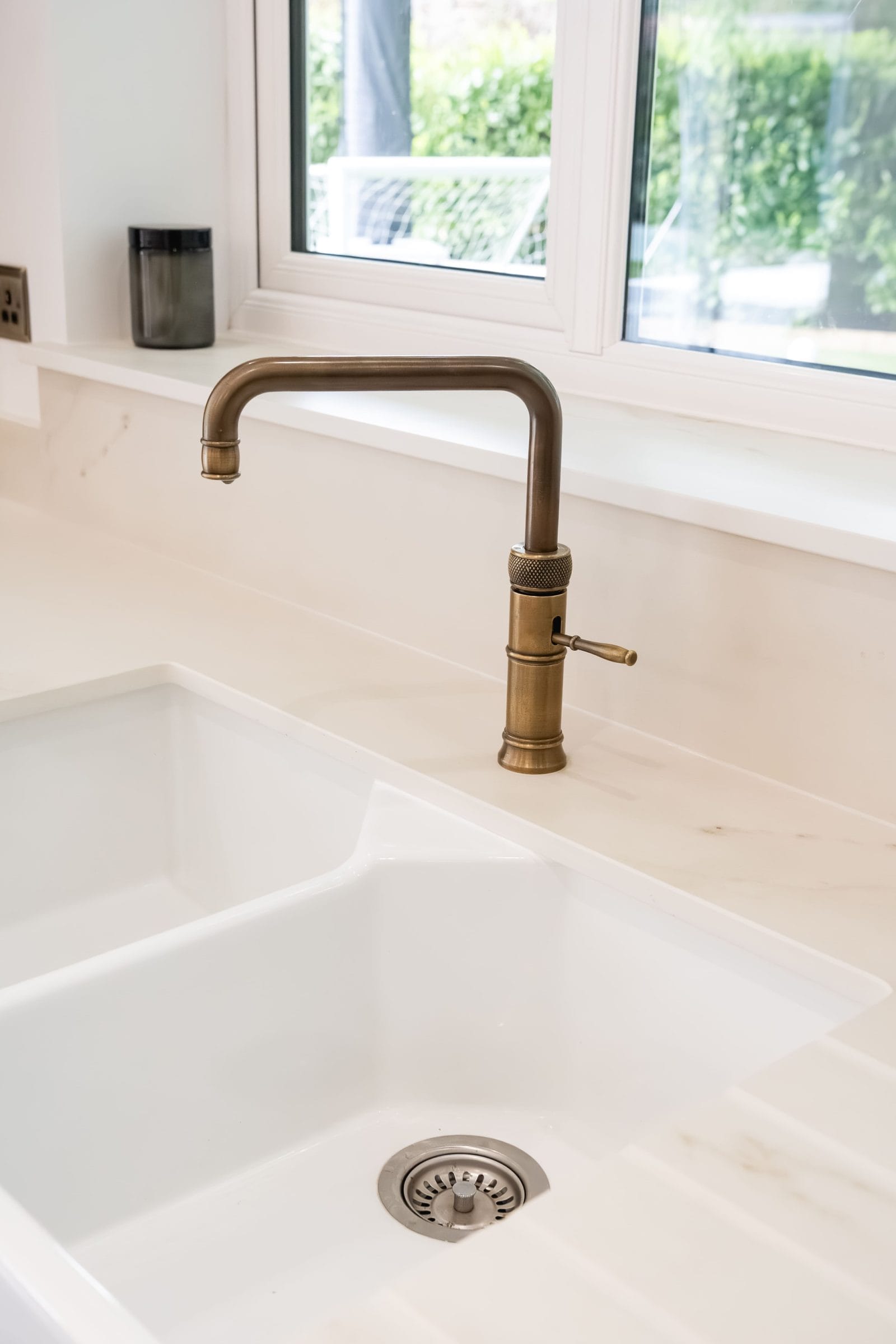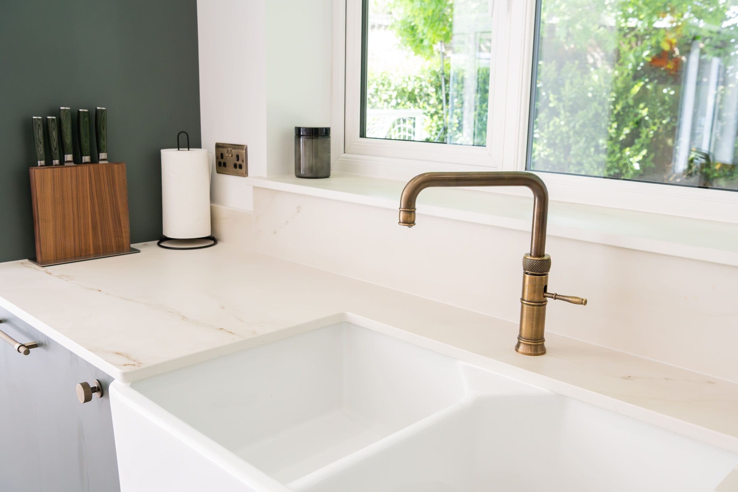 The elegant splashback and worktops from Dekton add a touch of luxury, and the island, with waterfall-mitred ends, doubles as a casual dining area. This kitchen transformed our customer’s daily routines and brought the ‘wow factor’ into their home.
