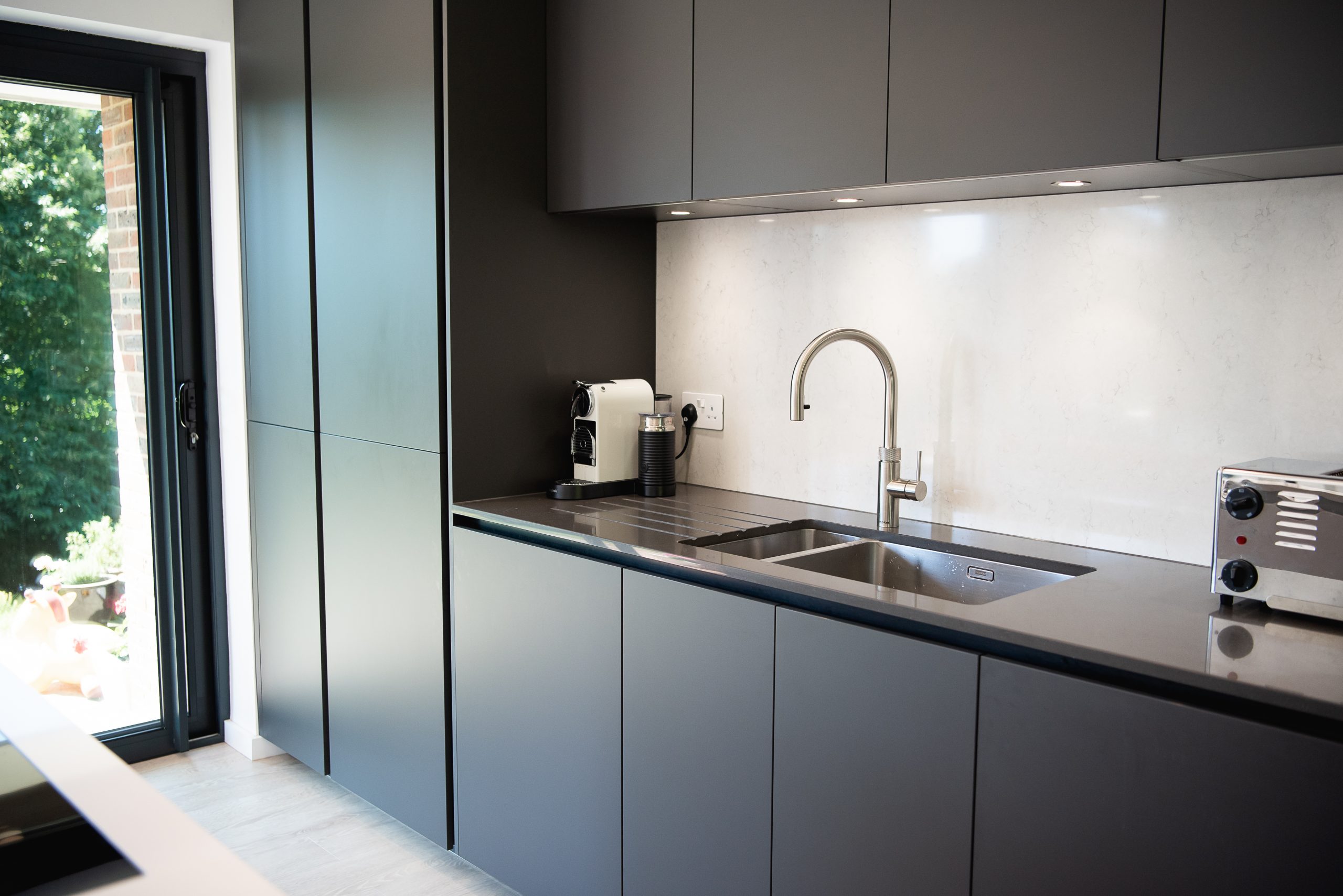 This open plan space seamlessly flows between the kitchen, dining and living area. Full of light the large doors are a real feature of the kitchen area. The handleless door and large linear island are sleek and contemporay complimented with all the kitchen tech you need including a Bora hob and Quooker tap. The large island with seating for 4 is perfect for family life!