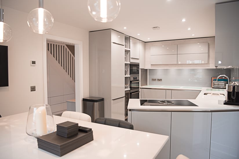 The glowing quality established by the gloss cabinets certainly creates a luxurious feel, but we have also included a host of other design features that help to elevate the space. Custom designed shelves situated above the wine cooler make a stunning spot for our clients to display glasses. Overhead cupboards built into a subtly textured surround and a custom peninsula are so much more than just ingenious storage solutions. Striking pendant lights accentuate the island dining table adding yet another stylish touch to our client’s Orpington kitchen. Attention to detail takes this elegant and understated interior to the next level.