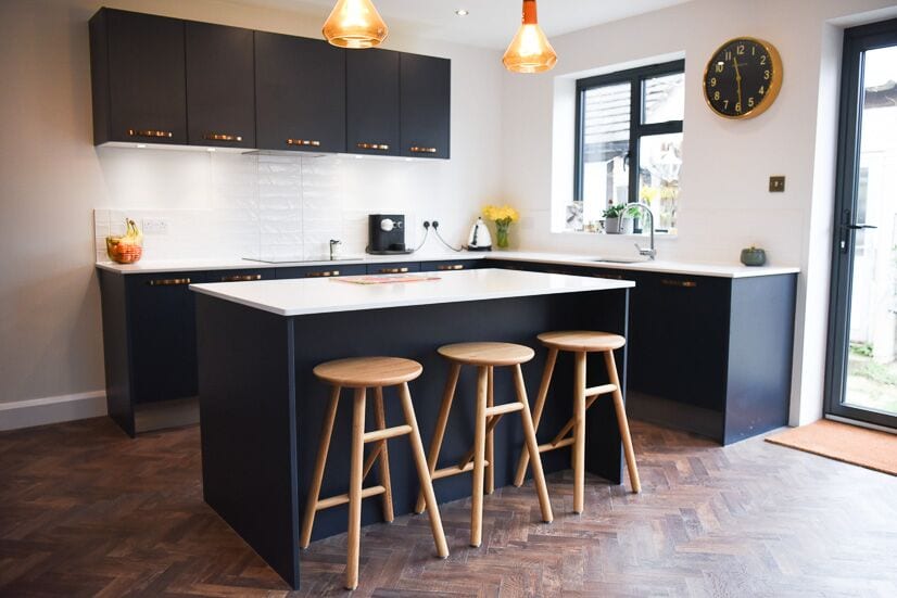 Flat-panel cabinetry strikes a wonderful balance between the seamless minimalism of a handleless design, and the classic character of a shaker style kitchen, and this beautiful Bromley interior captures this versatility perfectly. Scandinavian-inspired oak bar stools sit atop a charming traditional herringbone floor. These natural wood elements introduce a homely edge to the sleek cabinetry which demonstrates the wonderful flexibility of the flat-panel design.