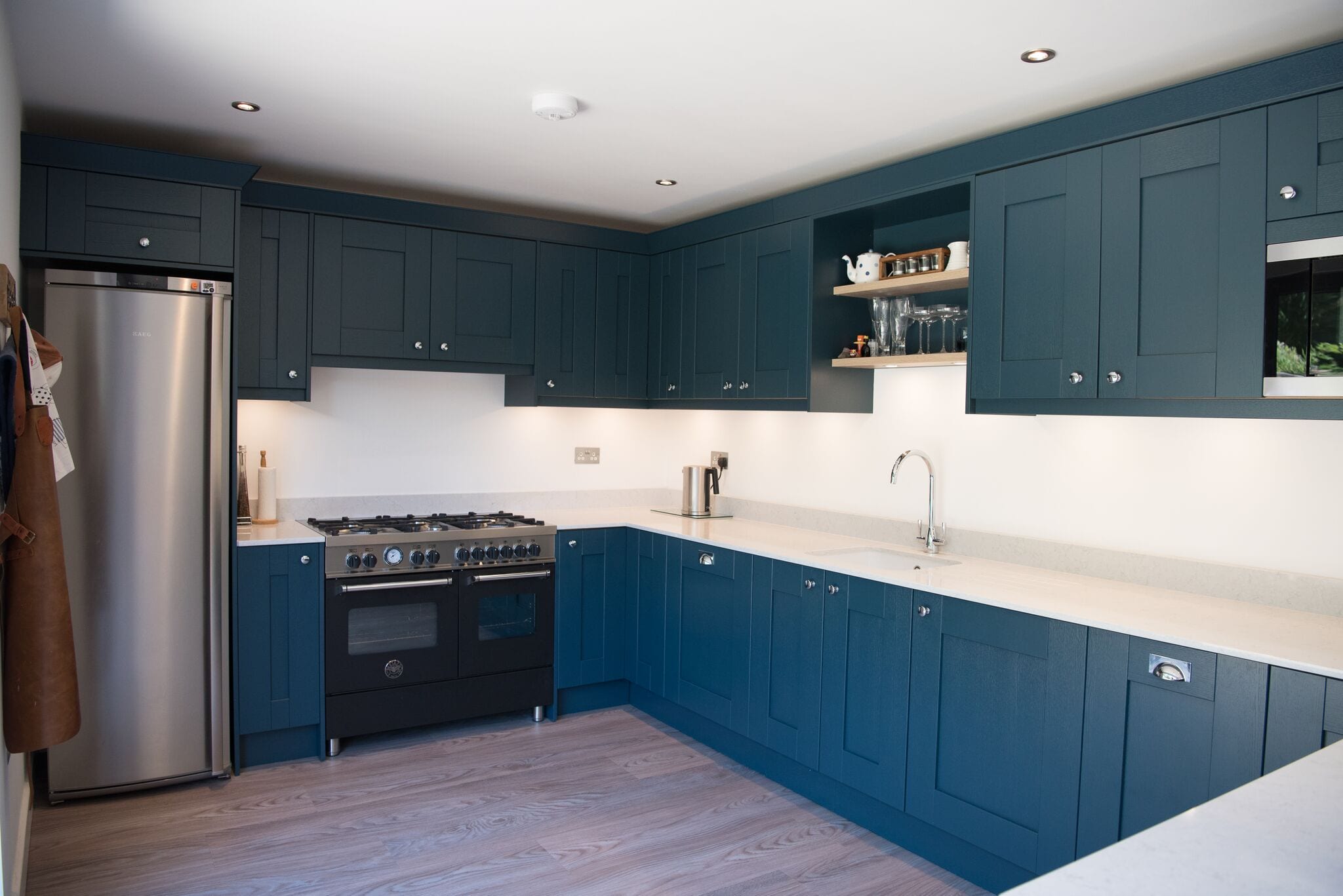 The ever-enduring shaker kitchen is a popular choice with many of our clients and looking at this wonderfully bright and inviting Sevenoaks kitchen it’s not hard to see why. The classic shaker door design adds characterful detailing whilst also providing an understated enough canvas allowing you to introduce a colour that communicates your individual personality and style. The vivid dark teal blue chosen by our Sevenoaks client creates a lively atmosphere that’s the perfect backdrop for family life. White walls and work surfaces balance the colour scheme keeping the space feeling bright and airy.