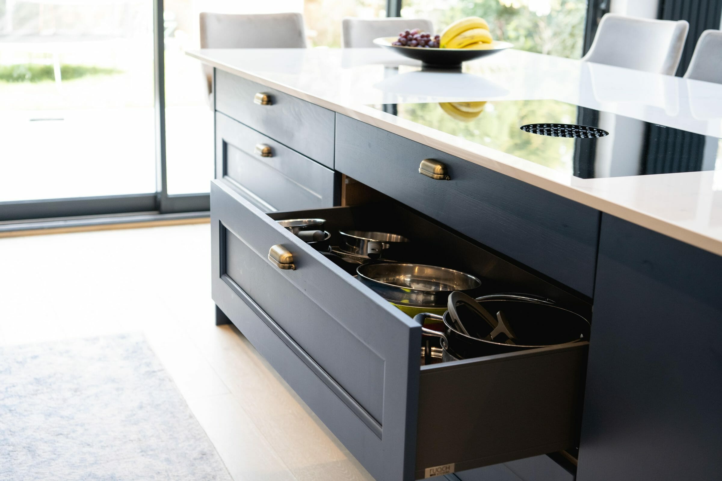 When planning an in-frame kitchen, ensure your kitchen layout facilitates easy movement and workflow. The in-frame design can be adapted to various kitchen shapes, including L-shaped, U-shaped, and galley kitchens. You can also maximise space within this design by incorporating innovative storage solutions like pull-out larders, integrated spice racks, and deep drawers, all of which complement the in-frame design.