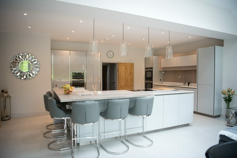 Finding the perfect view framing layout to suit our client’s space was essential. That’s where the impressive kitchen island comes in. It provides plenty of room for cooking while looking out across the beautiful garden. The innovative Bora venting hob prevents a bulky cooker hood from blocking the view. Meanwhile, tall wall units offer ample space for storage and appliances. Our Tonbridge clients envisaged a sleek modern space. They selected a stunning gloss grey finish while we introduced a touch of ash to soften the scheme and reference the garden view. Our clients couldn’t have been more pleased with their showstopping contemporary interior.