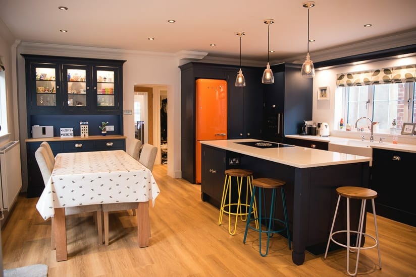 Our Tunbridge Wells clients were looking for a cosy, characterful and practical family kitchen. Needless to say, they were absolutely delighted with their finished space. The deep navy blue colour scheme sets a warm and inviting atmosphere while a bright orange Smeg fridge adds a playful touch. Instead of going with the more obvious shaker furniture, we recommended an easy to clean slab door with in-frame detailing for that charming classic feel. The furniture turned out to be one of our client’s favourite features. This homely yet trendy Tunbridge Wells kitchen is brimming with storage everywhere you look — perfect for a busy family.