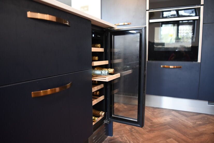 If you are looking for a sleeker, more minimalist kitchen design, you can cleverly integrate your wine storage into pull-out drawers. With a tilted wine rack, the bottles are stored them at the correct angle and keep them hidden away until you’re ready to kick back and relax with a glass of your favourite vintage.