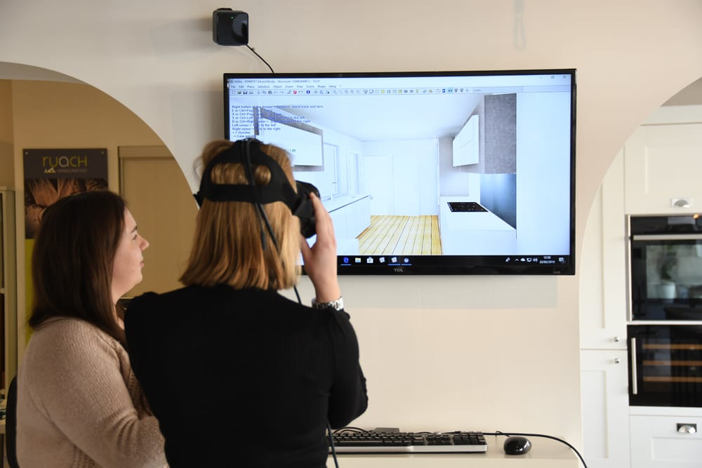 a customer tryin gout the virtual reality headset with her kitchen design whilst the designer stands next to her watching on the screen
